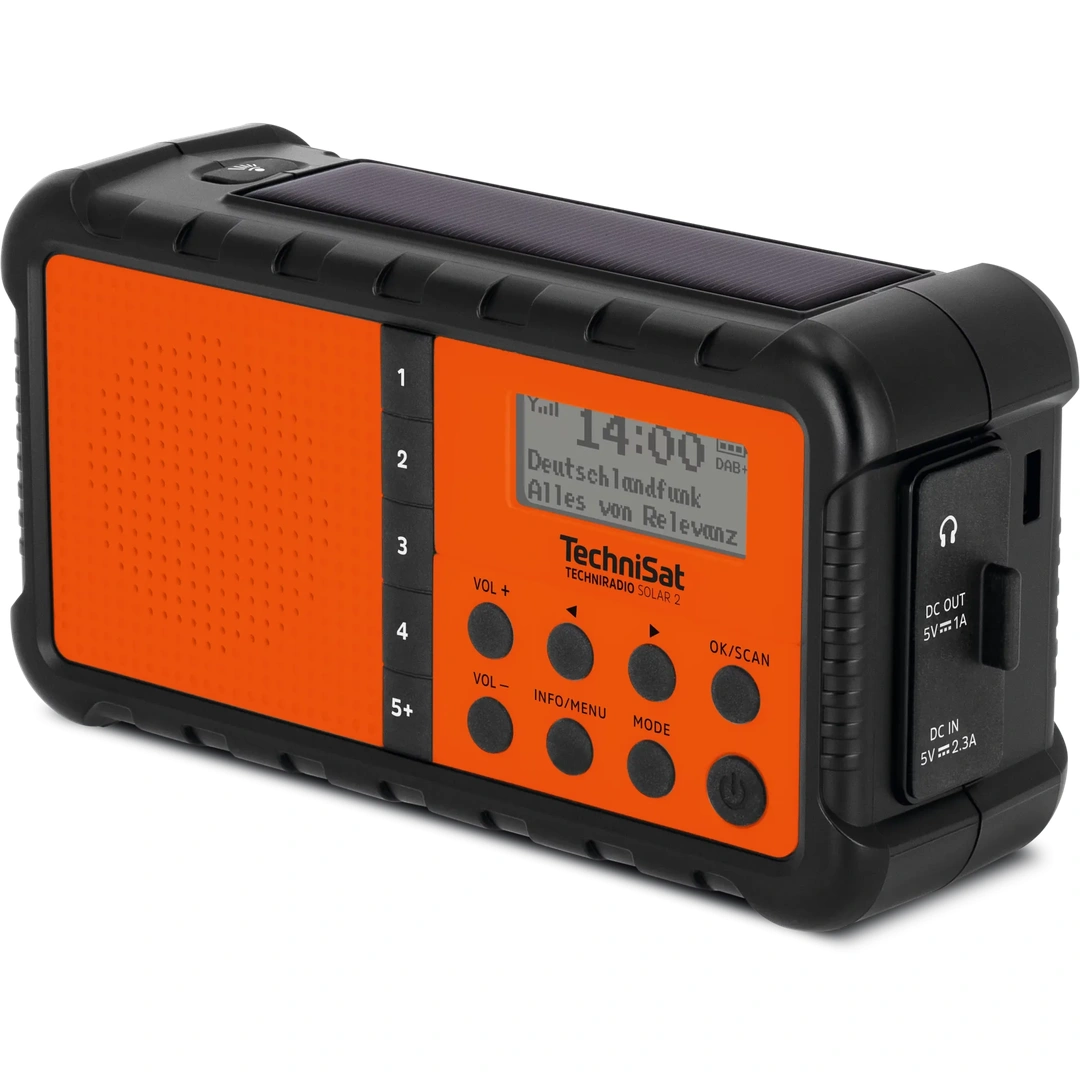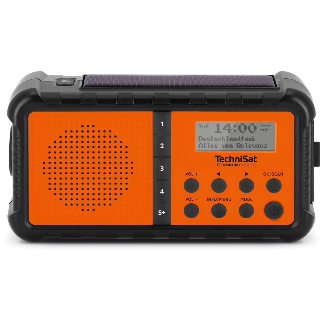 TechniSat TECHNIRADIO SOLAR 2 to zaawansowane radio solarne na korbkę, które łączy w jednym kompaktowym urządzeniu cyfrowy odbiornik DAB+/FM, panel słoneczny, dynamo na korbkę, wbudowaną latarkę LED oraz funkcję powerbanku. To radio stworzone z myślą o przetrwaniu – czy to na szlaku turystycznym, podczas wyprawy ekspedycyjnej, czy w sytuacji kryzysowej, gdy standardowa infrastruktura przestaje działać.