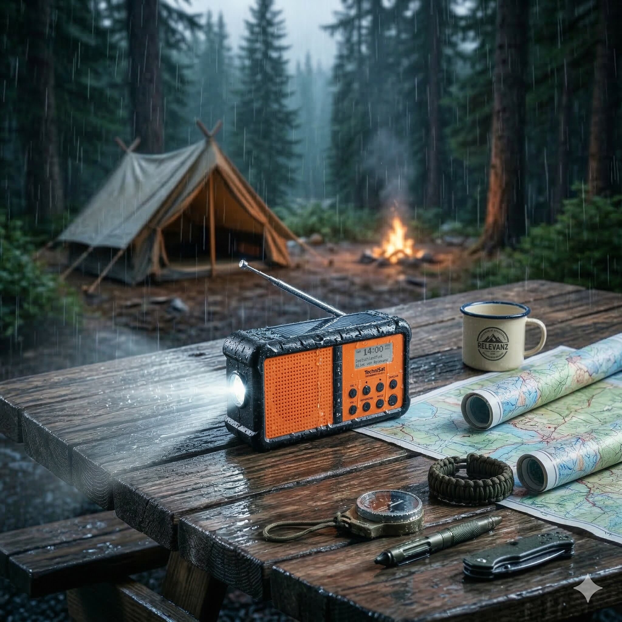 Radio solarne na korbkę – Twoja niezależność energetyczna w terenieRadio technisat techniradio solar 2 w deszczu z zapaloną latarką